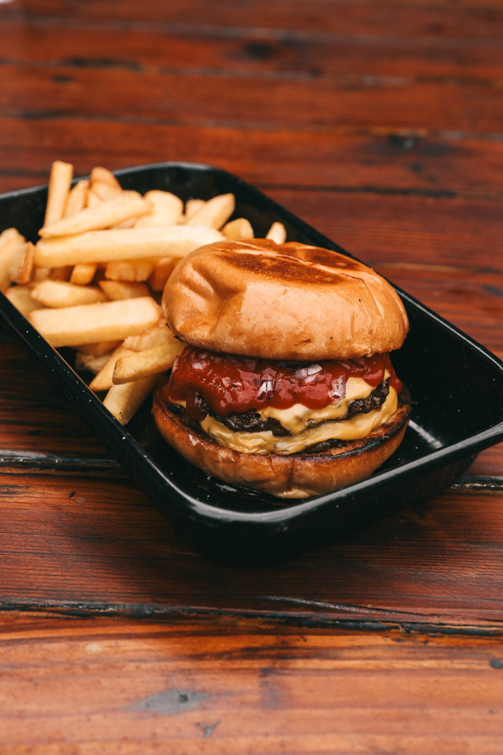 Dos medallones de carne a la parrilla, cheddar Milkaut, ketchup y cebolla morada.